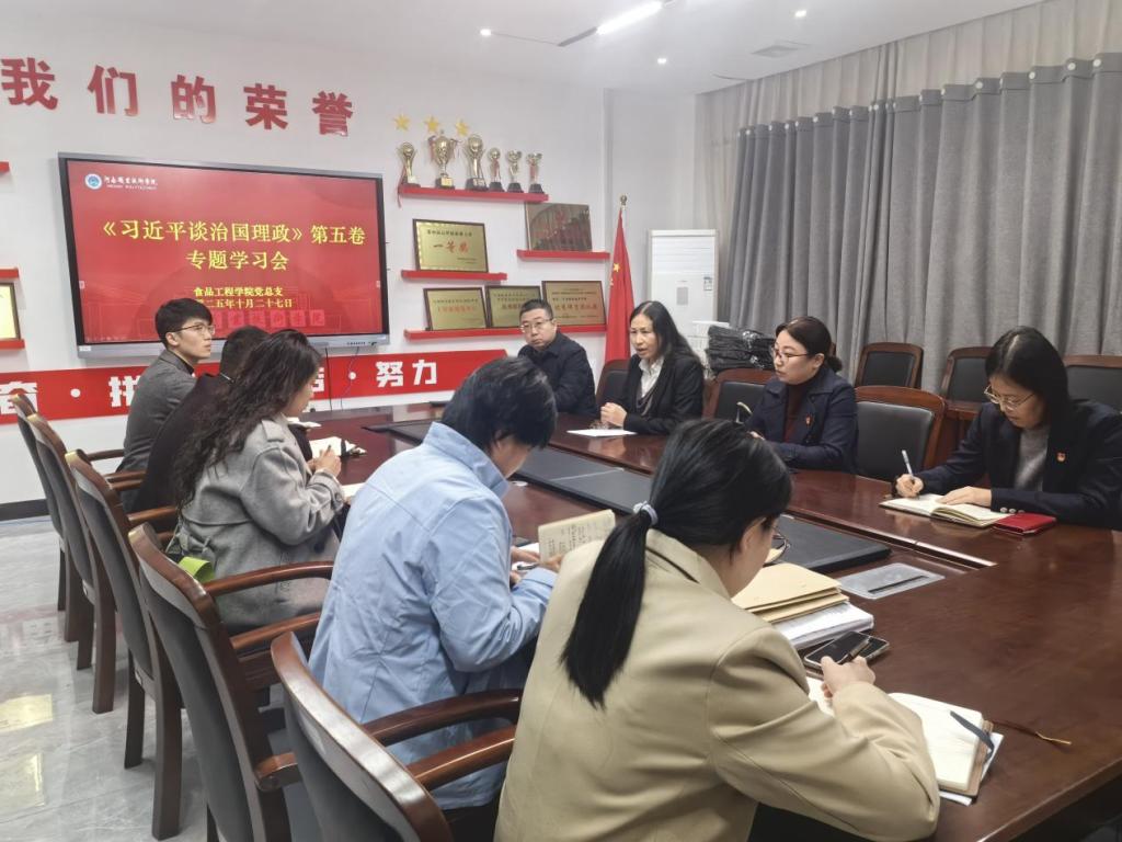 学习会上,王延东带领全体党员深入研读《习近平谈治国理政》第五卷核心内容。她指出,该书集中展现了马克思主义中国化时代化的最新成果,是指引新时代教育事业发展的权威著作。全体教师要以“读原著、学原文、悟原理”的态度,深刻领悟“两个确立”的决定性意义,将“六个必须坚持”的立场观点方法融入食品专业教育教学实践,以“食”代先锋的政治自觉筑牢育人根基。
