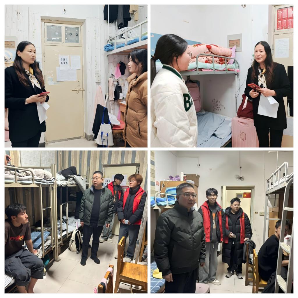 12月6日晚,党总支书记王延东、副书记张宇再次深入学生寝室,开展复查与督导。他们不仅对寝室安全状况进行再检查,更利用“一站式”学生社区贴近学生的优势,与同学们进行了亲切交流。王延东书记关切地询问同学们的学习生活情况,并结合实际案例,再次强调了树立“安全第一”意识、掌握基本防范技能、养成良好安全习惯的重要性,勉励大家共同维护安全、文明、和谐的社区环境。在检查中,发现个别寝室存在纸箱、杂物随意摆放的问题,王延东当场予以指正,并亲自指导学生进行规范整理,确保了消防通道的畅通和居住环境的整洁。
