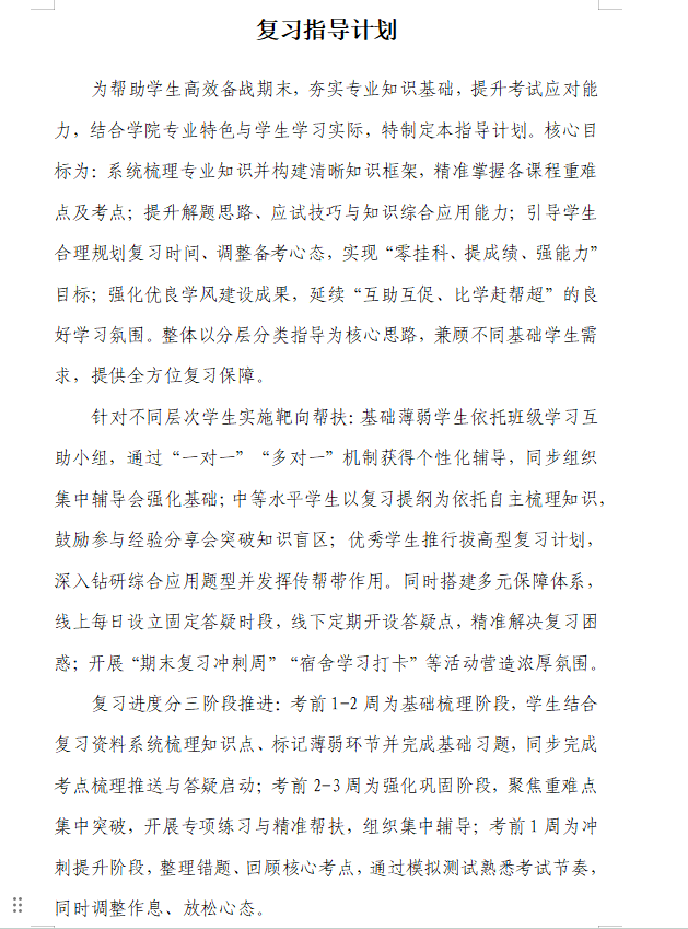 学院以宿舍管理为抓手,依托五级网格管理体系推进精细管理,开展“食韵书香”宿舍文化建设等特色活动。例如8号楼8709B宿舍(食检术253班)打造“食韵书香”主题宿舍,制作了“专业知识点手账”张贴于宿舍墙面,营造沉浸式学习氛围;在食品检验检测技术、食品智能加工技术等专业班级试点“宿舍学习打卡”制度,明确每晚8:30-9:30为固定打卡时段,采用“微信群定位打卡+笔记上传”的双重方式,由宿舍长每日核对打卡真实性;其中食检253班8709B宿舍连续3周打卡率100%。学院辅导员老师常态化深入宿舍,了解学生思想动态,针对学业困难、纪律观念薄弱等学生群体,帮助制定期末复习计划。例如针对食加252班尚书悦、何佳欢等5名文科同学,制定基础化学“每日监督+每周复盘”的个性化帮扶计划,由学习委员每日跟进学习状态,专业课教师定期开展知识点梳理;针对食加251班6名考前焦虑严重的学生,辅导员通过焦虑情绪疏导、复习计划优化等形式,帮助学生调整心态,以良好状态应对考试,全方位助力学生提升。