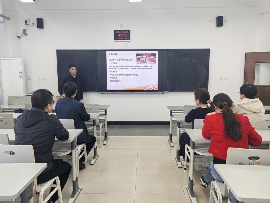 教学展示环节,尚益民以注水肉检测项目为重点,现场讲解实训操作流程,并深入剖析该技术的关键要点;吴怡然则围绕农产品质量检测技术主题,结合近年来我国农产品质量安全典型案例,系统讲授检测技术的标准规范与常用方法。展示过程中,河南开放大学乡村振兴学院师生认真观摩、积极互动,现场教学氛围浓厚,示范效果良好。