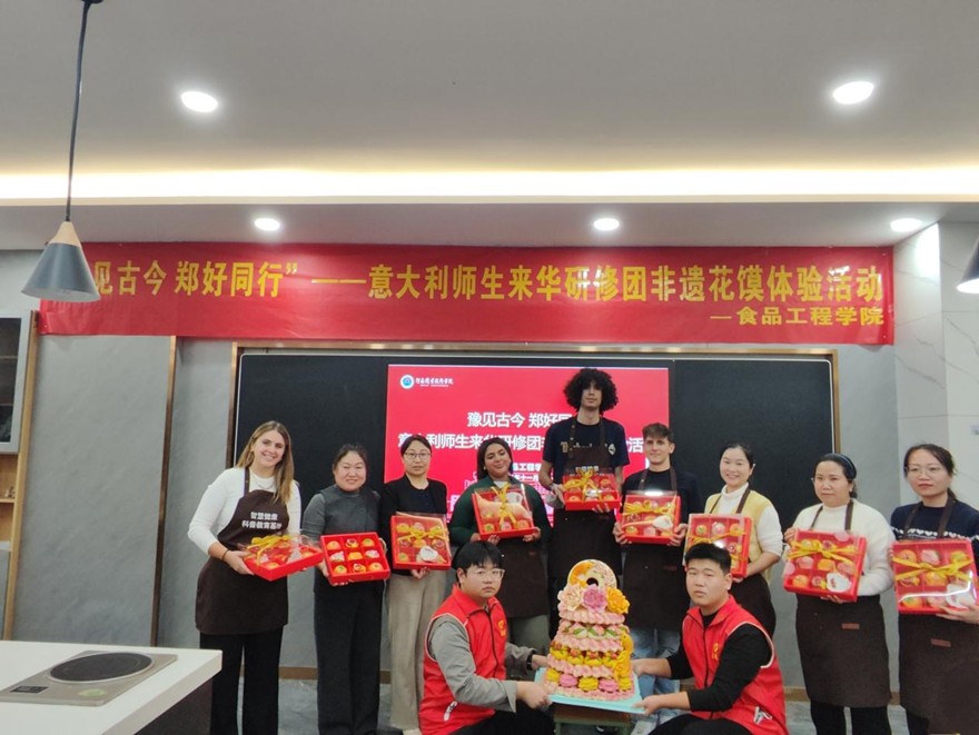 11月21日,作为“豫见古今 郑好同行”系列文化交流活动的重要组成部分,意大利师生研修团走进食品工程学院,参与了一场富有文化底蕴与互动趣味的非遗花馍体验活动。食品工程学院院长胡二坤及学院教师代表热情接待了远道而来的客人,并全程陪同交流。