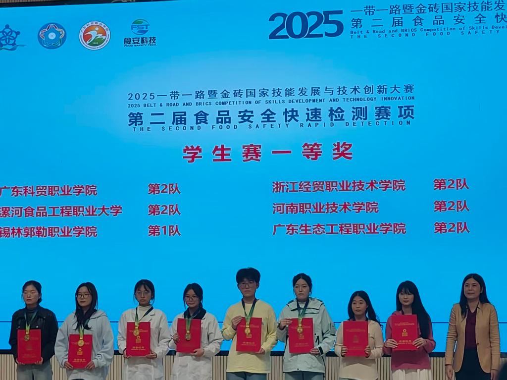近日,2025“一带一路”暨金砖国家技能发展与技术创新大赛第二届食品安全快速检测赛项全国总决赛在广东科贸职业学院圆满落幕。食品工程学院学生团队凭借扎实的专业基础、规范的操作技能和出色的临场发挥,从全国75所院校的500余名参赛选手中脱颖而出,勇夺一金一银,充分展现了学院在食品质量与安全领域的教学实力和人才培养成效。